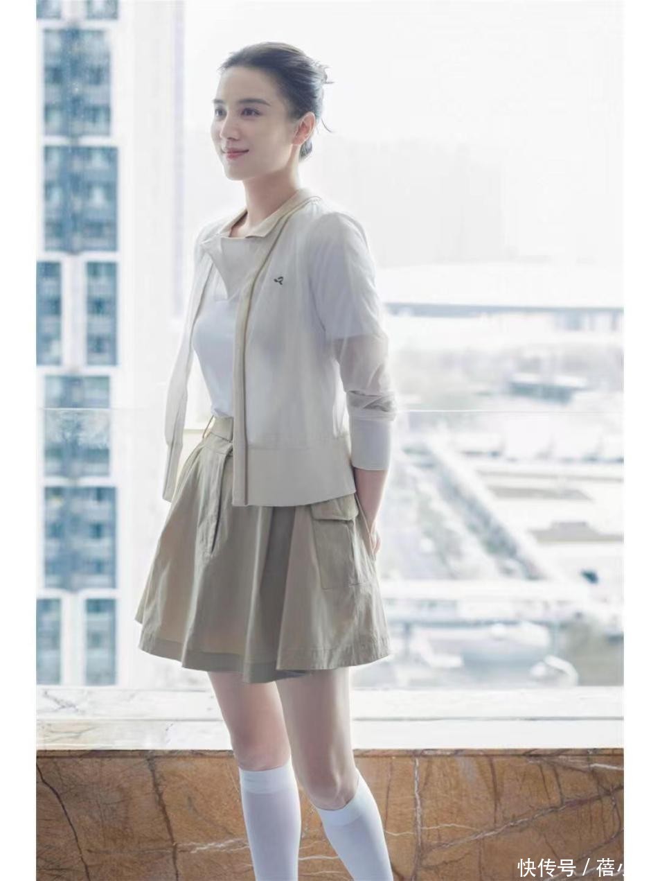 短袖衣摆选拔了塞进裙子腰部,这样作念的原因很浅易,即是为了拉长腿部线条。