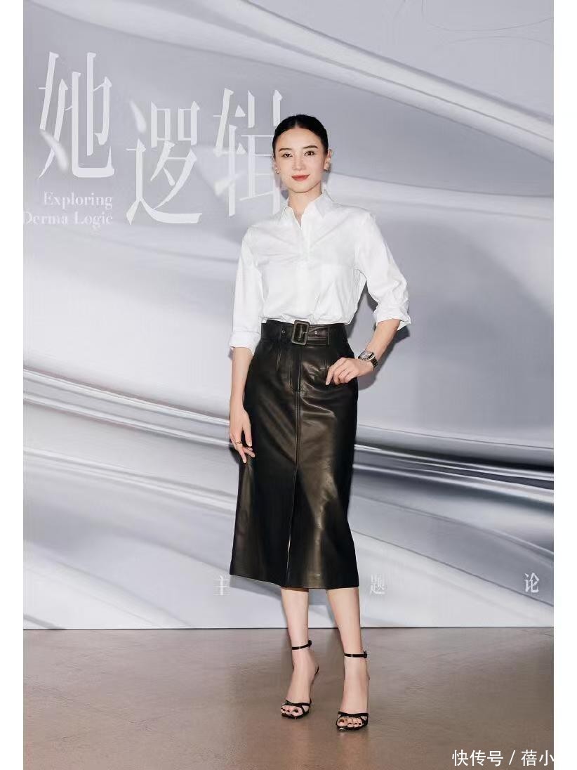 白衬衫搭配性强,女神下身选拔了一款高腰直筒皮裙。